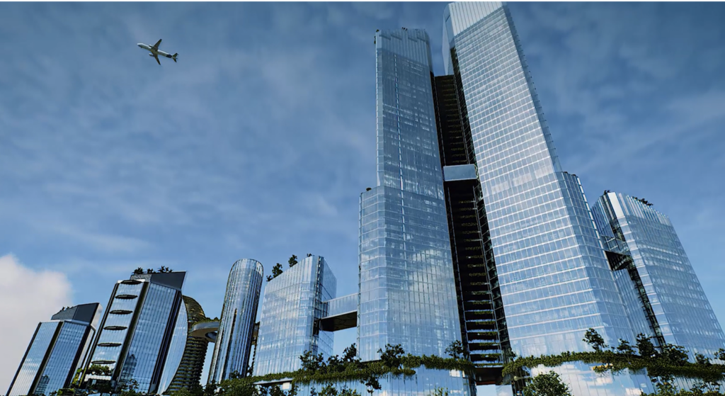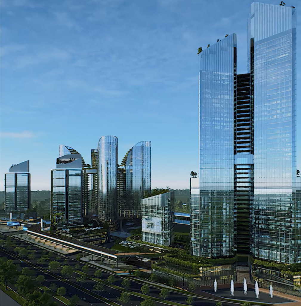 “The Gateway” project features two symmetrical but mirrored buildings, each with a Ground + 28-storey structure. These buildings are designed to serve as the gateway to the Oasis project. Just like the signature, each building has retail areas on the podium floors, office spaces in the intermediate levels, and hotel accommodations on the upper floors.